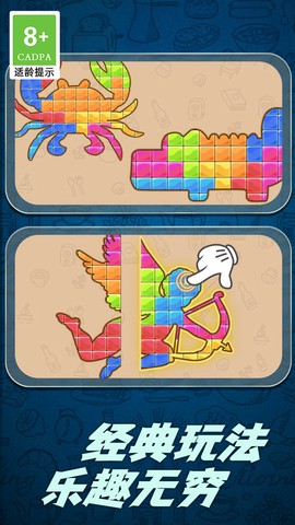 在拼图挑战的关卡中,玩家会遇到形态各异的画作,只有找出合适的方块,才能顺利拼凑出完整的图案。每个关卡都是一场全新的冒险,结合了简洁的视觉风格和经典的拼图挑战,给玩家带来无与伦比的快乐。