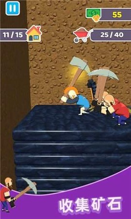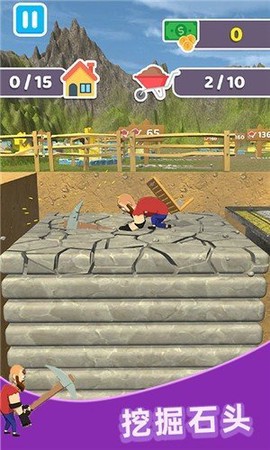 2. 玩法模拟了包工头角色,带领团队挖掘矿石宝物,利用普通石头与木材组合打造基础房屋。