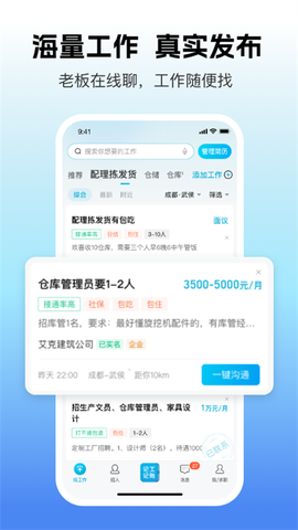 1、丰富的工作资源让求职更迅速,随时与老板在线聊天,工作机会轻松获取。